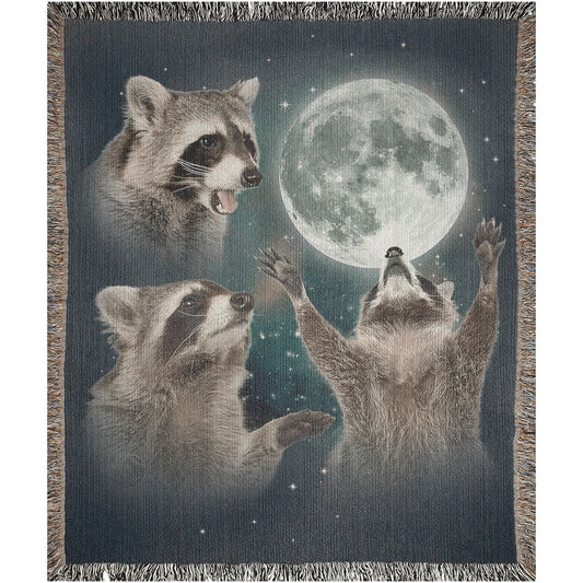 Three Raccoons Howling at Moon Retro Woven Blanket