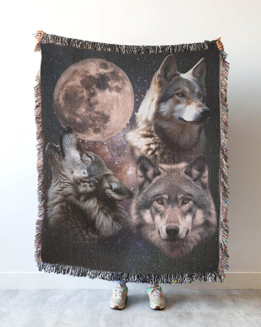 Three Wolves And The Moon Retro Woven Blanket.