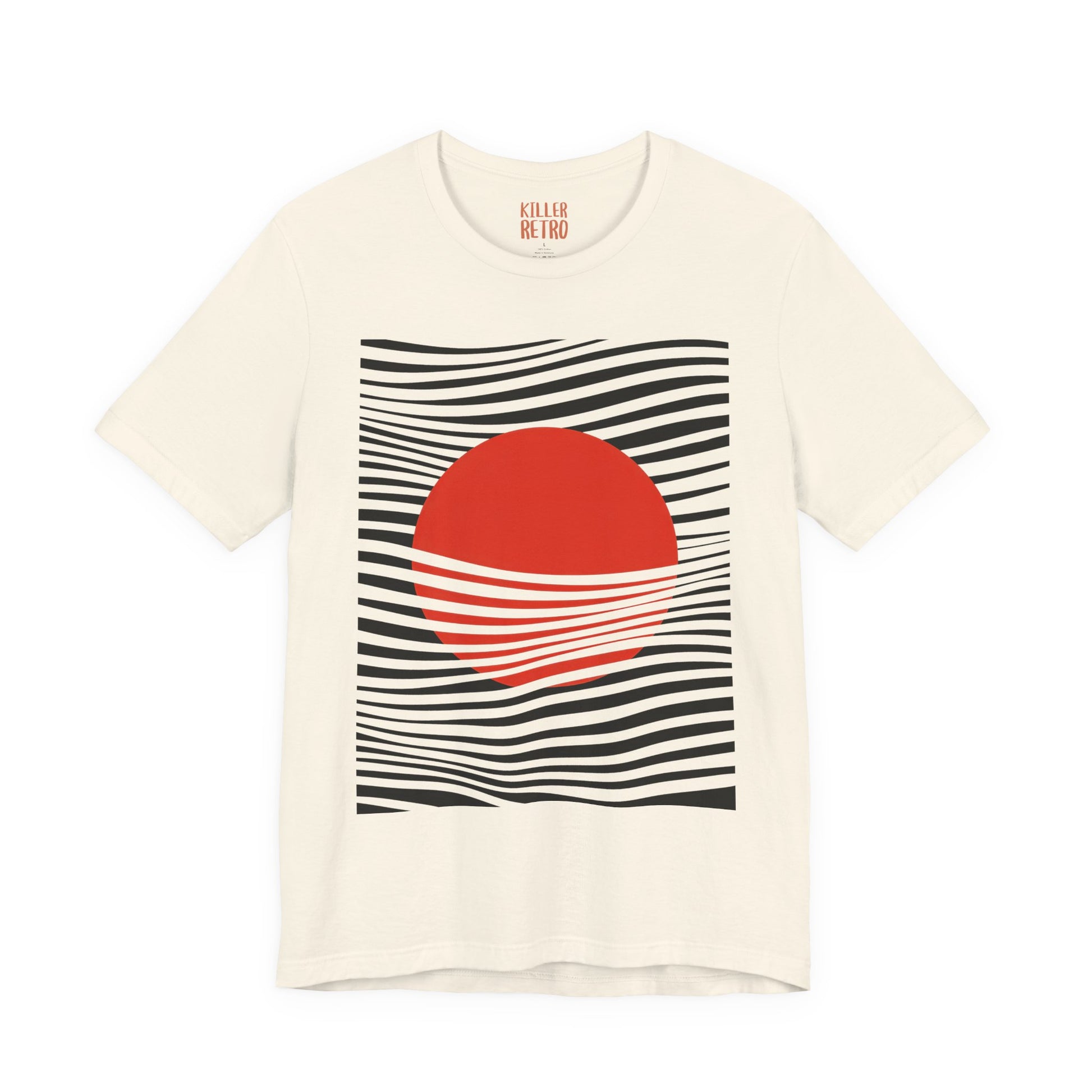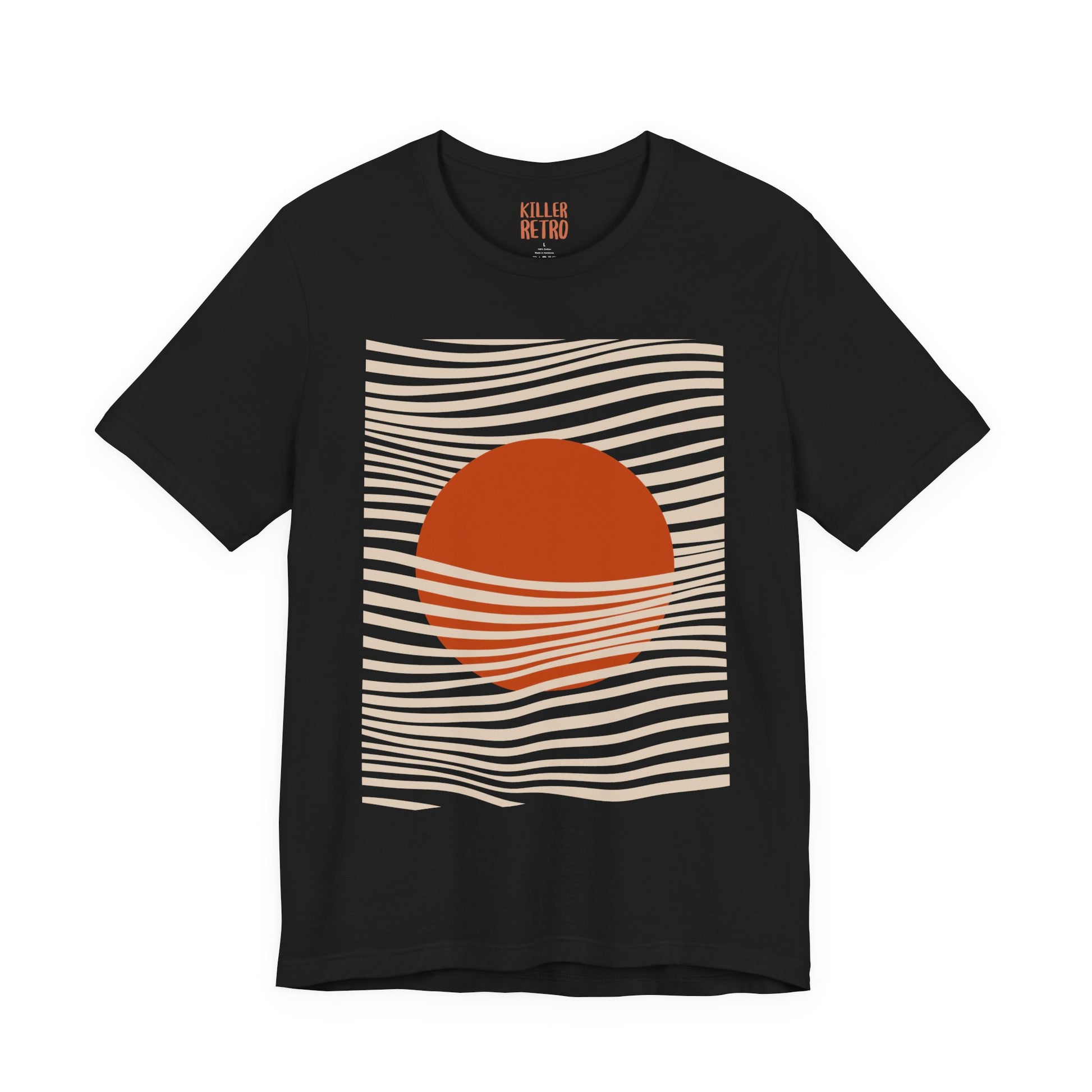Soft, breathable cotton meets bold, minimalist art. This tee features a crisp rectangular print: a warm, red sun partially veiled by flowing black lines that ripple across the chest. The lightweight Bella Canvas fabric drapes easily for everyday movement and layers well under jackets. Wear it on city walks at golden hour, to gallery openings, or while sketching at a café — it reads as thoughtful, modern, and quietly expressive. The subtle crew neck and clean silhouette let the graphic speak, while the tear-away label keeps comfort front and center.