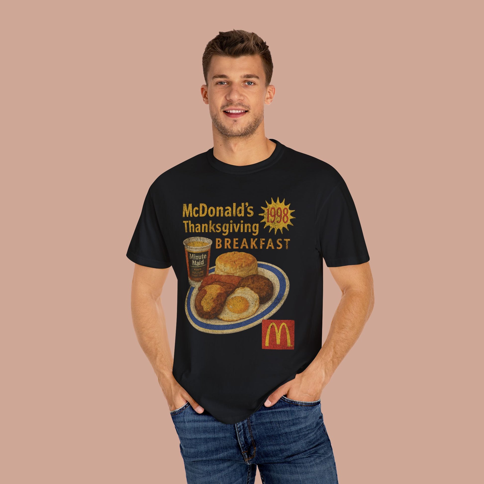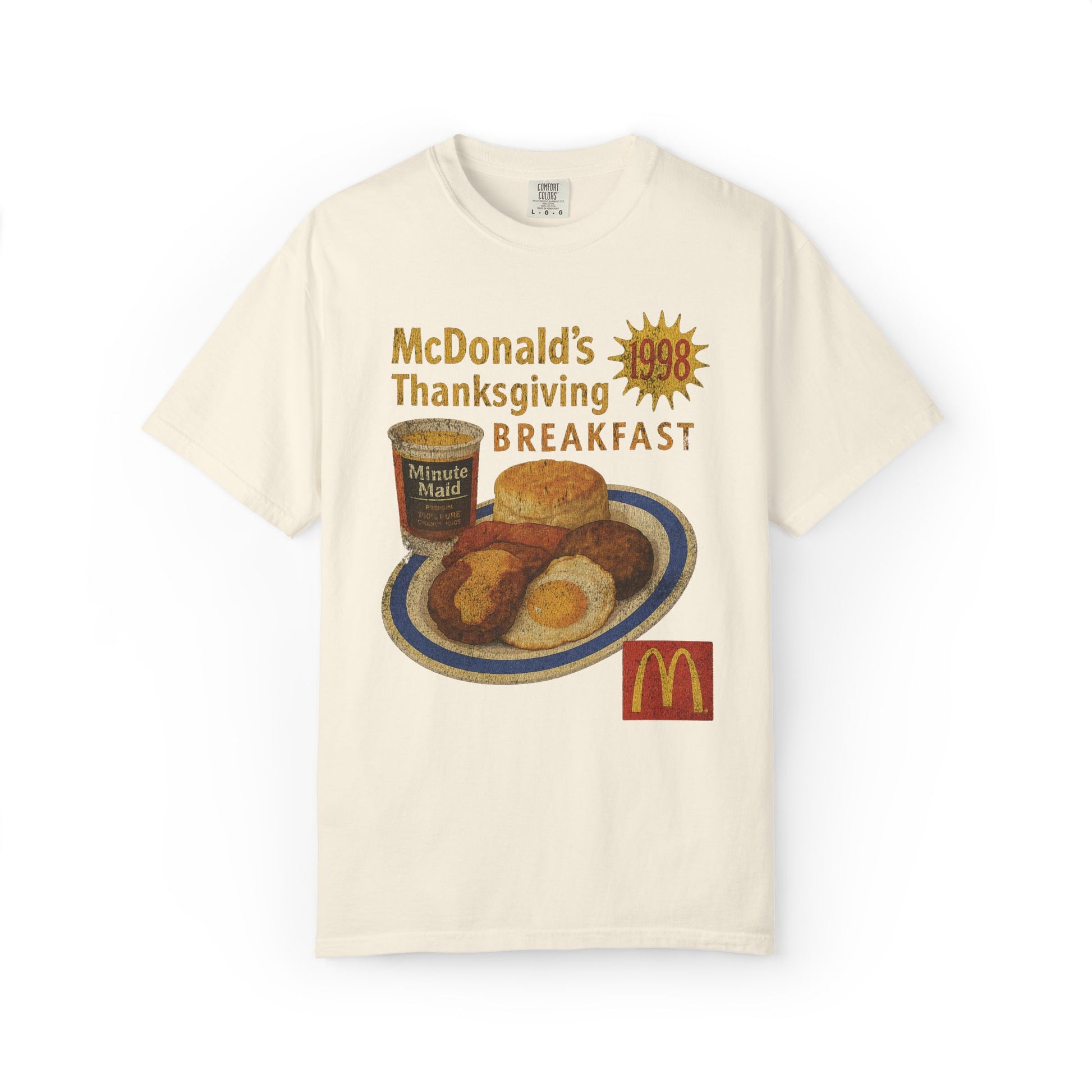 This vintage 1998 Mc Donalds Thanksgiving Breakfast T-shirt offers a retro 90's style with a unique graphic tee design. Perfect for streetwear enthusiasts, this Comfort Colors tee is made of high-quality, garment-dyed fabric for a soft and comfortable feel.