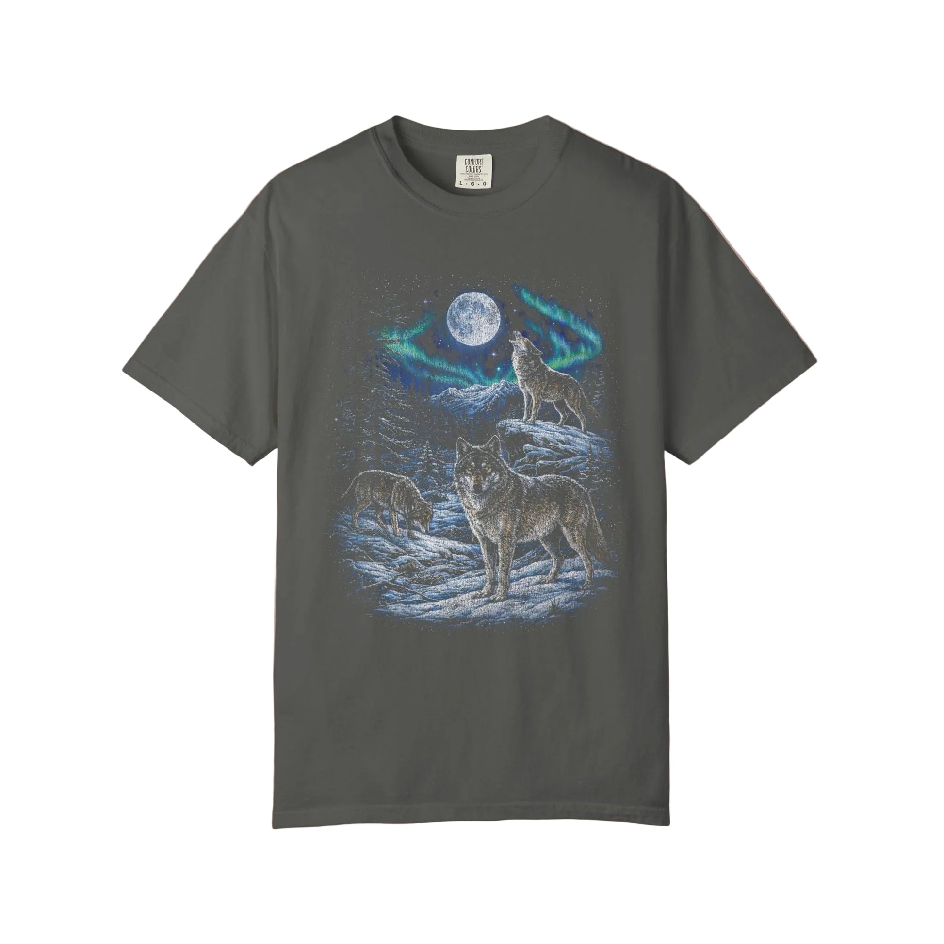 Be a wolf! A relaxed, garment-dyed tee that carries a quiet, wild-night energy. Soft, broken-in color and heavyweight cotton drape comfortably while a moonlit wolf scene anchors the front—wolves standing on rocky ground beneath a full moon and shimmering aurora.