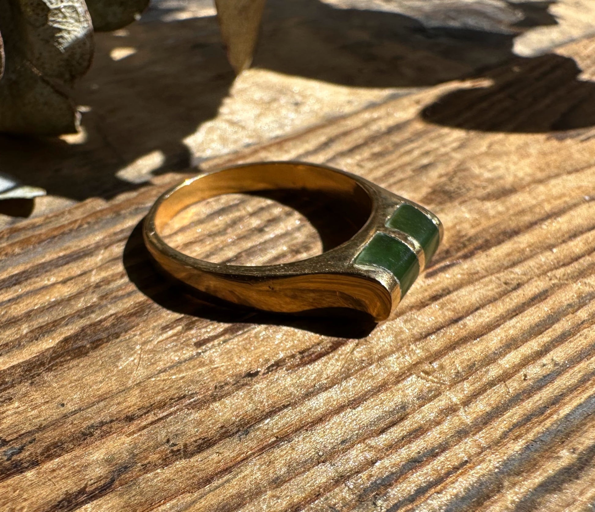 This Jade ring is stunningly crafted, featuring beautiful Canadian Nephrite Jade set into gold-plated. Stamped S.S