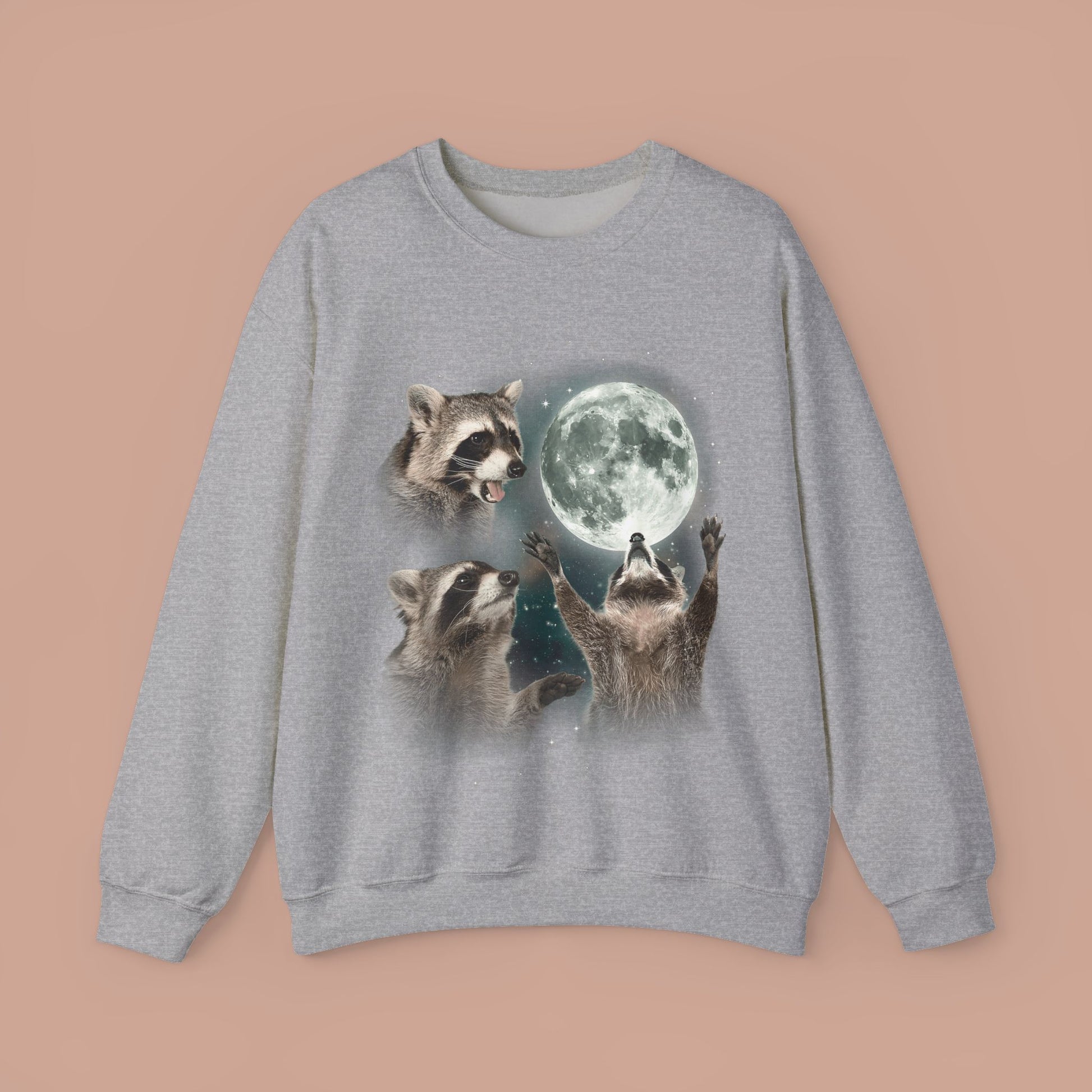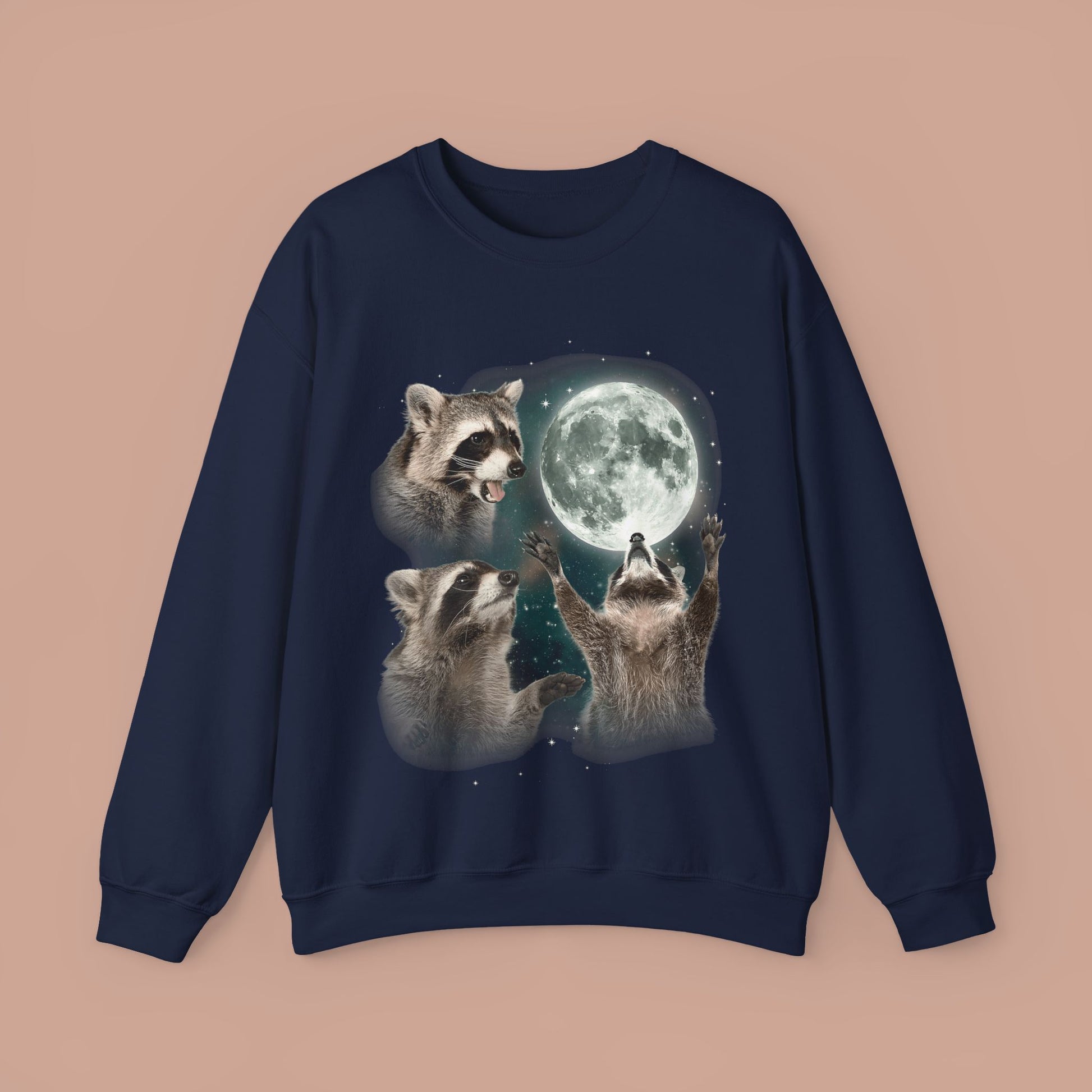 Get ready to howl at the moon with this vintage sweatshirt featuring three playful raccoons gazing up at a majestic moon. This retro design adds a touch of whimsy to any outfit. Just don't be surprised if people start asking where you found such a unique and fun piece!